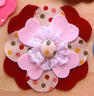 直径 各8センチ前後 使用材料 フェルト/コットンブロード/コットンレース/アクリルレース 包みボタン/ボタン/プラスチックビーズ/スパンコール/ブローチピン