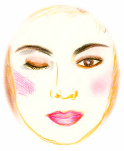 6 チークはおちついたローズ系のパウダータイプのものをブラシで、目の下に指1本分ほどの間隔をあけて、頬骨の高い位置を囲うように、耳の付け根に向かって フェイドアウトさせます。 |