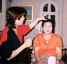 手も口も良く動いたメイクでした。本当に 右側の写真は 幸せそうじゃありませんか?口紅を 多少お召し物の色を考えて オレンジよりの赤にしてみましたが、お肌の色を引き立てて 綺麗に出来ていると思います。 後から ご自分のお持ちのアイシャドウを見せてくださりながら 使い方を復習なさるところなど これから きっと もっと 綺麗になっていかれるように思いました。楽しく ありがとうございました。