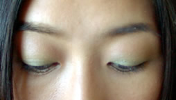 1 お目元全体に クリアベージュのパウダーアイカラーを 大き目のアイメイクブラシでざっと伸ばします。 6 マツゲは 軽くカールさせ、ダークグリーンのマスカラを 目尻側に重点を置いて丁寧につけるようにします。 7 眉。この方の眉は もともと 良い形をしておいでなので、軽くシェイプさせるようにしたり、毛の長さをそろえるくらいで あとは メイクの様子を見て 長さや色の調整をなさるとよろしいでしょう。